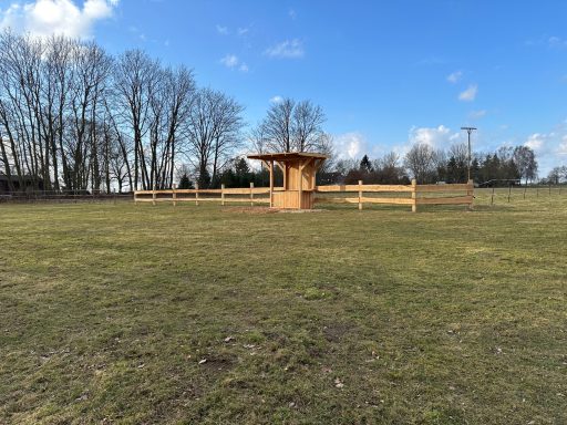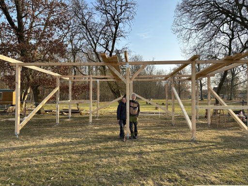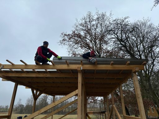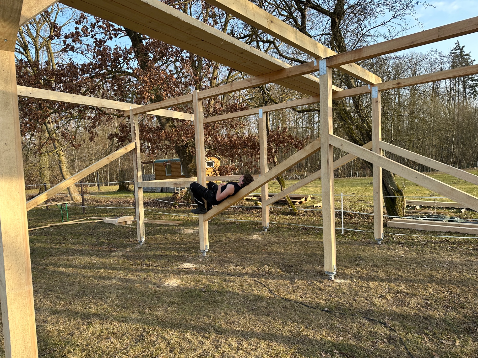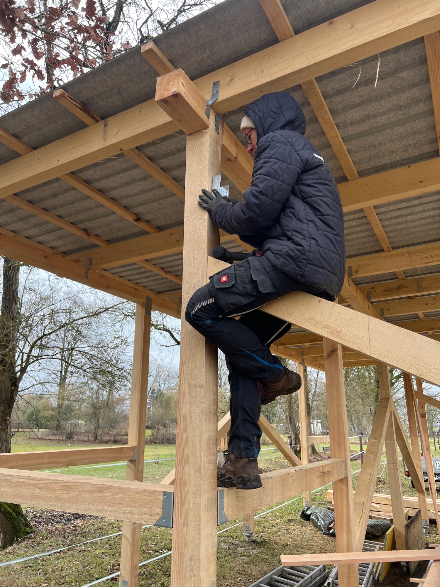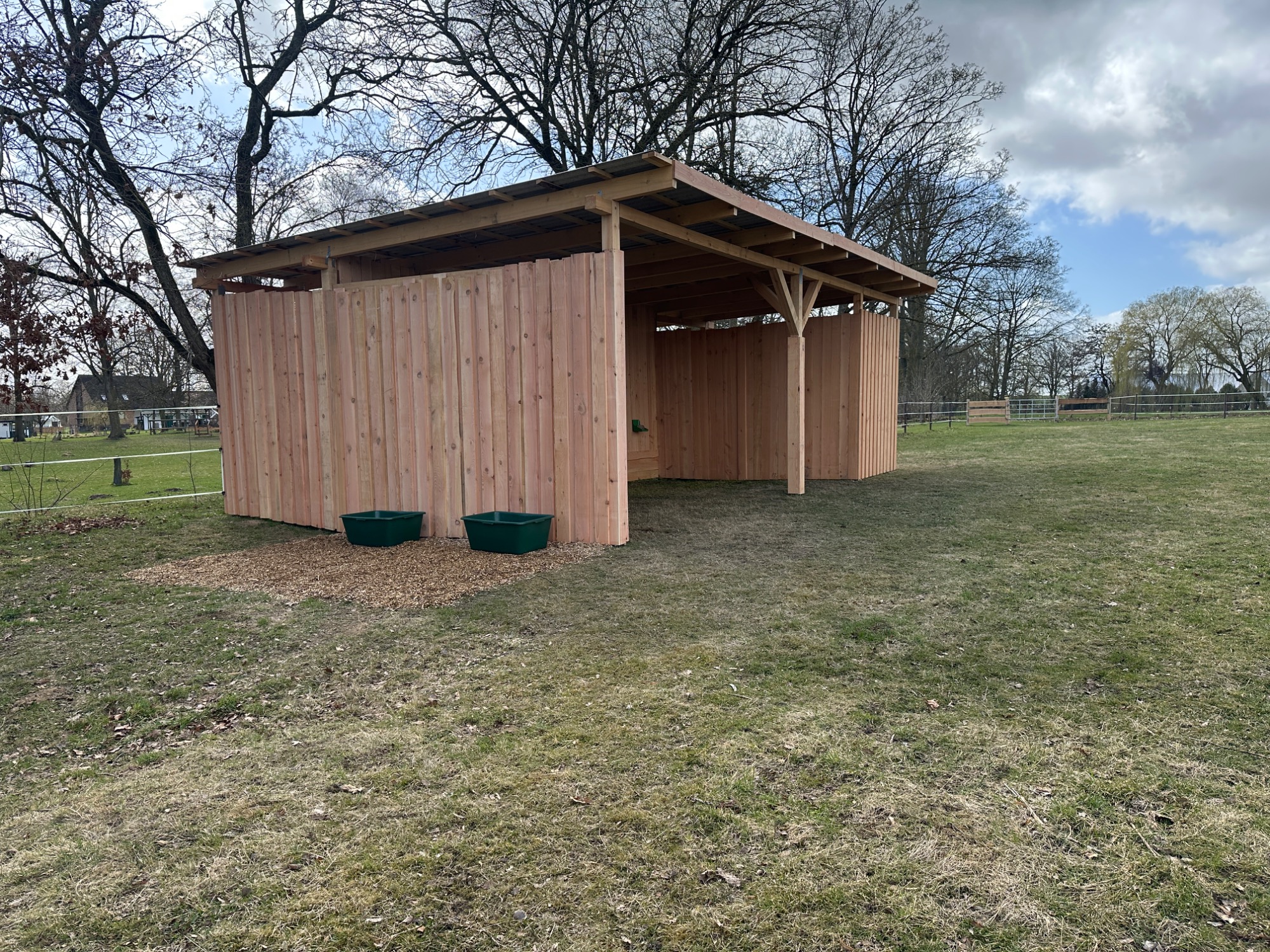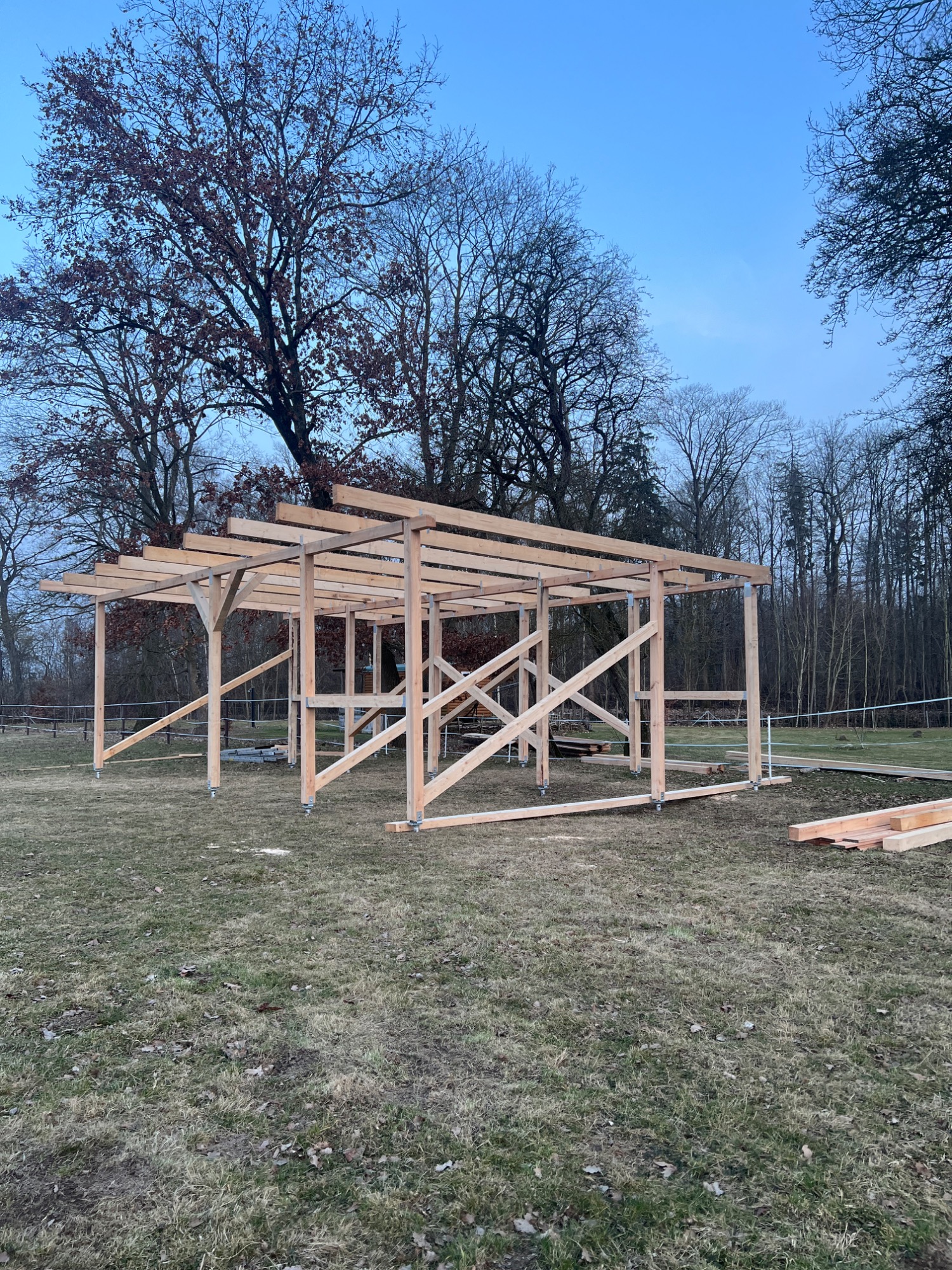 Endlich kann es losgehen. Viele Hände - schaffen Wände. Nach 2 Tagen Arbeit konnten wir quasi Richtfest feiern. Der Weideunterstand nimmt Formen an.