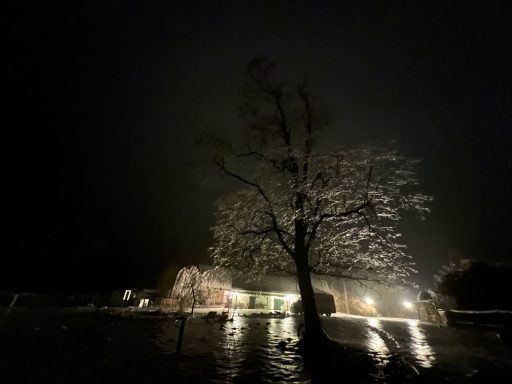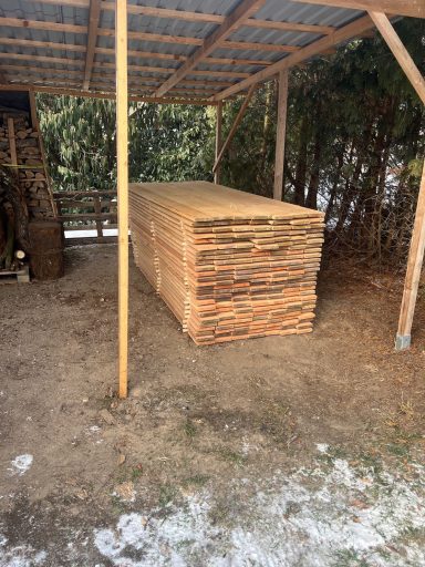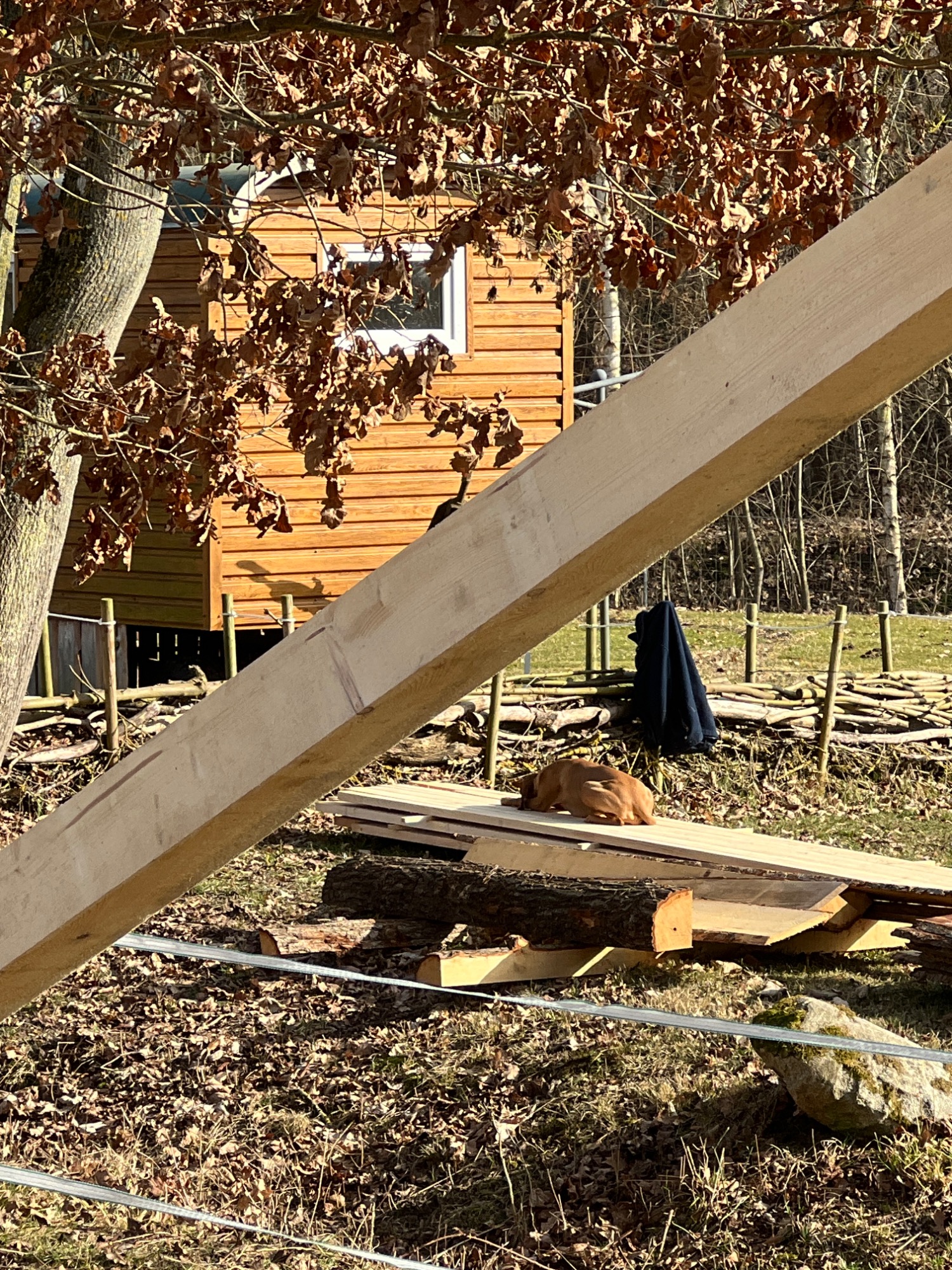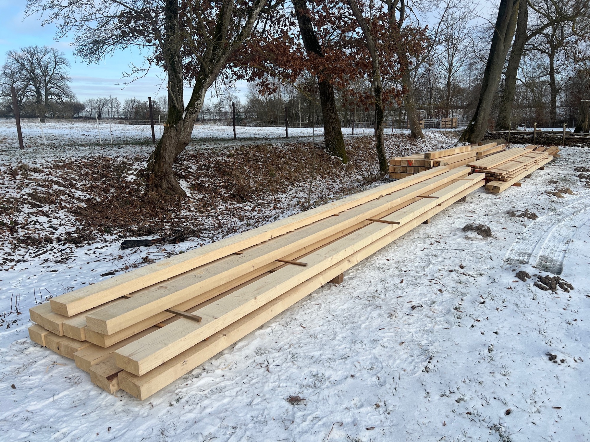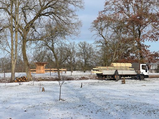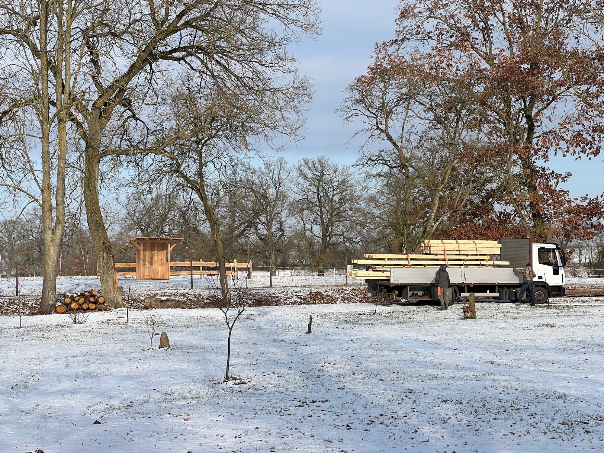 Wenn die Holz-Lieferung für den Weideunterstand (mit Holzlager und Geräteraum) zeitgleich mit 12cm Neuschnee kommt, gefolgt von mehreren Zentimetern Eispanzer - dann heißt es estmal Pause - und auf den Frühling hoffen.